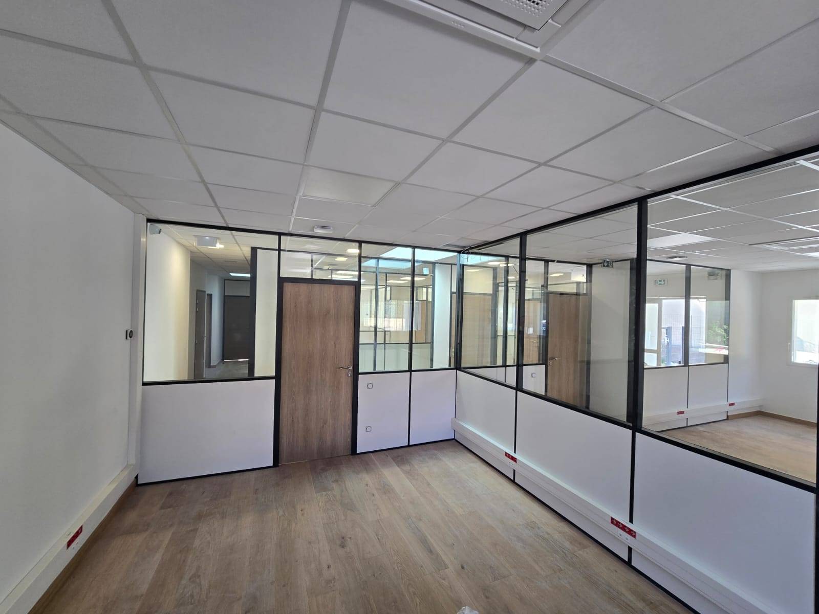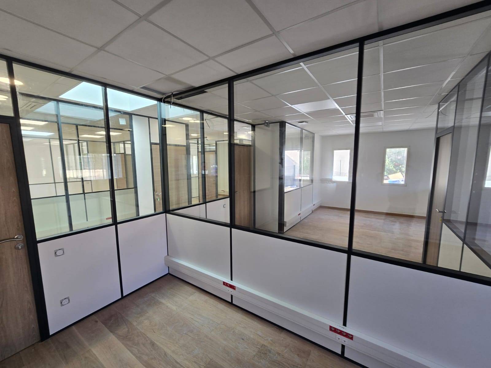 De plus, la pose des vitrages dans les cloisons en P26 a nécessité une précision accrue. Nous avons dû ajuster les fixations et les dimensions des panneaux pour garantir une installation parfaite des vitres, tout en respectant les normes de sécurité et de performance acoustique. Un suivi rigoureux a été effectué à chaque étape du chantier afin d’assurer la conformité avec les exigences du client et de respecter les délais.